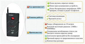 Поиск скрытых камер (в том числе проводных), осуществляется посредством отраженного света от мигающих светодиодов в окуляре прибора.